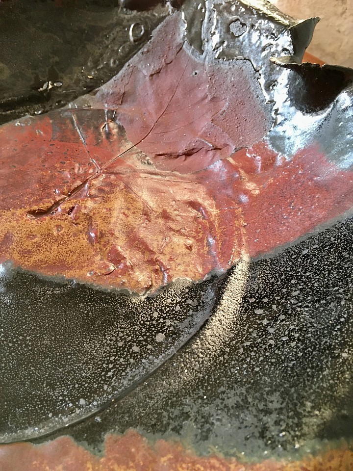 Photo de pièces rouges ( vase, plat, grand feu ) et rouge et noir avec feuille